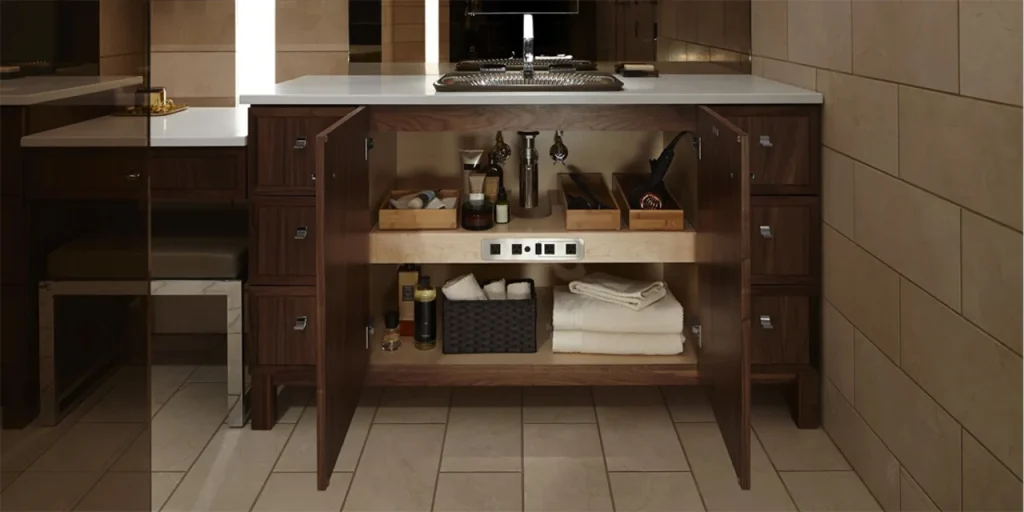 Imagine a cabinet where you can safely plug in your hot tools and electric brushes. Built-in power outlets inside a shelf or drawer eliminate messy cords on your counter.