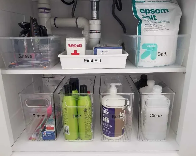 Transform cabinet chaos into complete clarity with clearly labeled containers. Use wide, handled acrylic bins and label them with specific categories like “Shave,” “Teeth,” or “First Aid.”