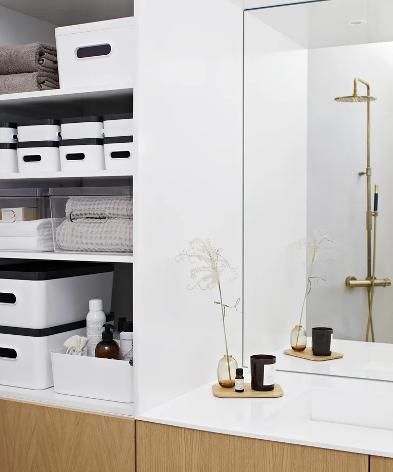 The uniform look of the white bins provides a calming, modern aesthetic to your entire bathroom.