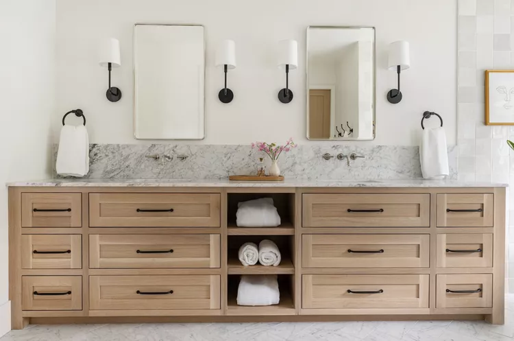 For a truly customized look, incorporate built-in open shelving into your vanity design. This creates dedicated, breezy storage for linens.