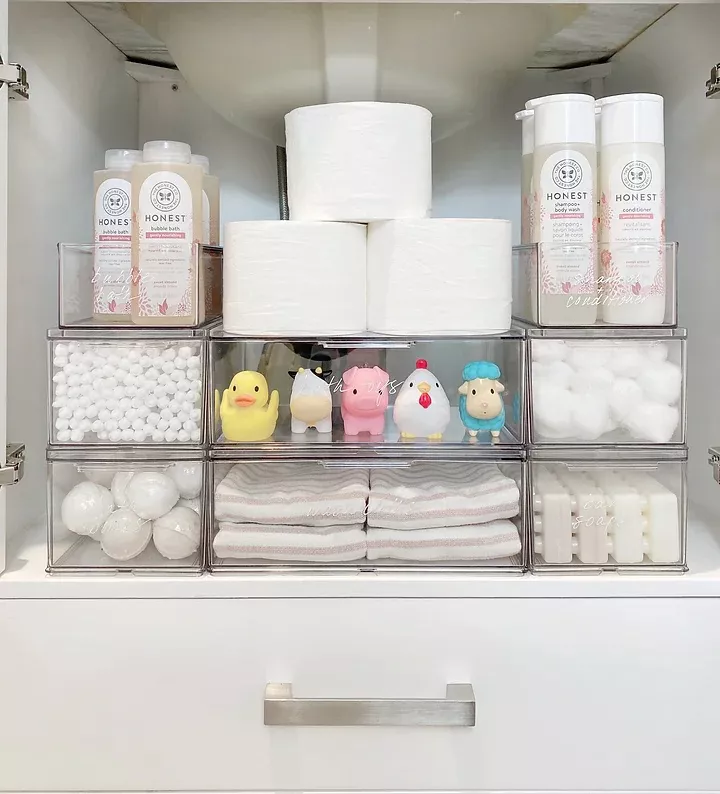 Clear, stackable acrylic bins are organization heroes for deep shelves. They allow you to see exactly what you have at a glance.