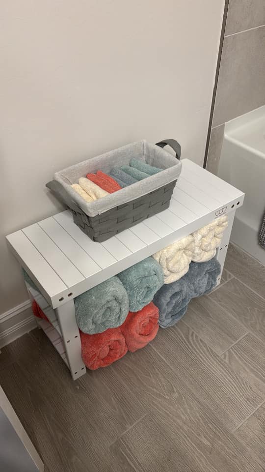 You can roll towels by color to create a soft, visual rhythm beneath the seat. A small basket on top holds washcloths or bath accessories.