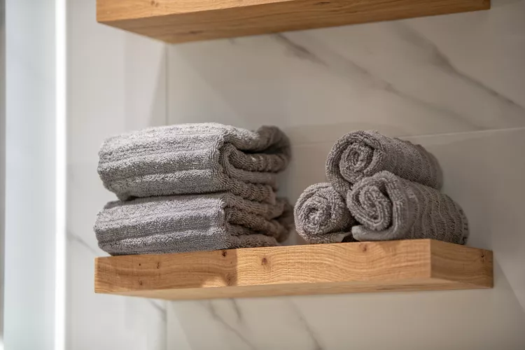 Wooden shelves bring natural warmth into the bathroom. You can stack towels by size or arrange a mix of rolled and folded styles to create depth.