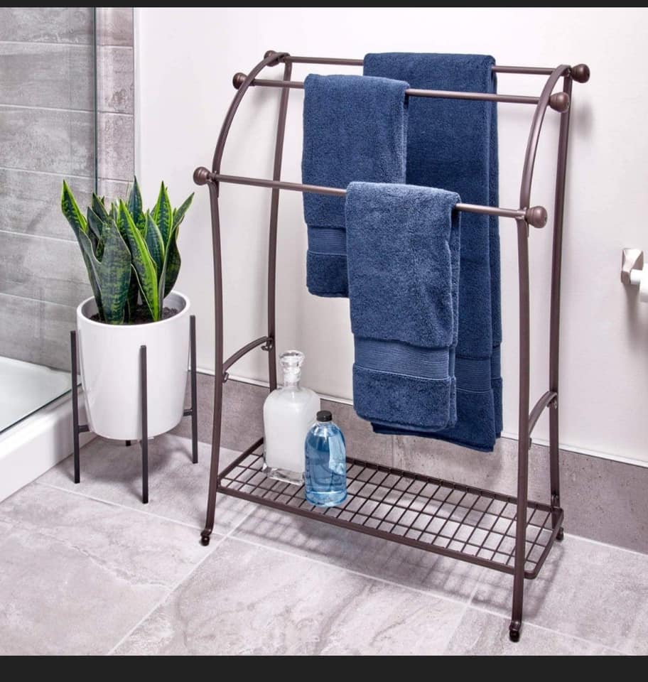 The bars hold fresh towels, while the bottom shelf stores extra rolls or small baskets. The open frame lets air flow around damp towels so they dry faster.