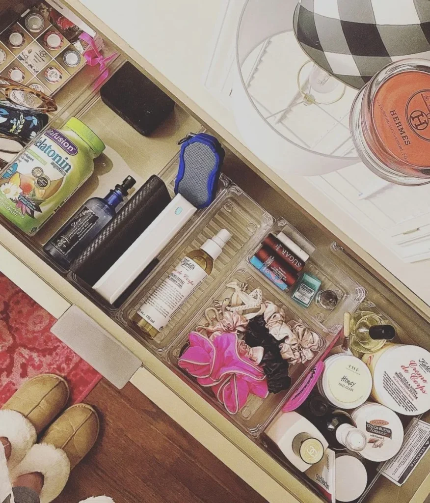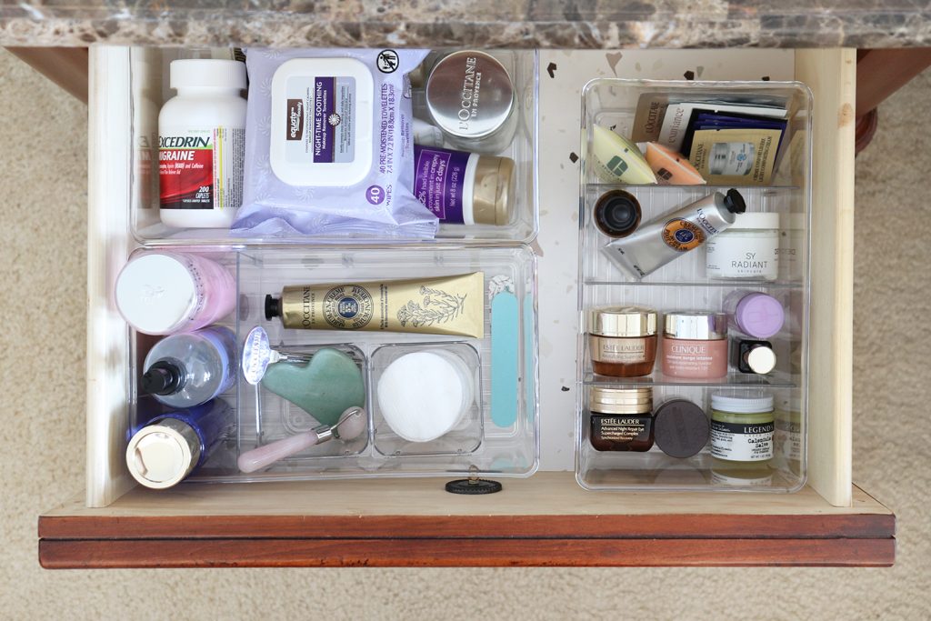 Dedicate a drawer to your nightly self-care routine. Use various clear plastic bins and small cups to sort skincare products, hair ties, and supplements.