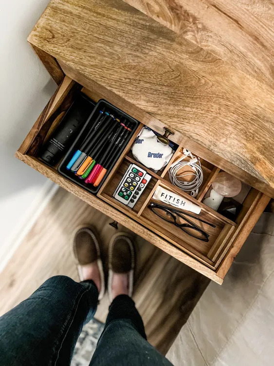 Keep your work and hobbies close but contained. Use a natural wood organizer with small, deep sections to corral charging bricks, colored pens, and your reading glasses.