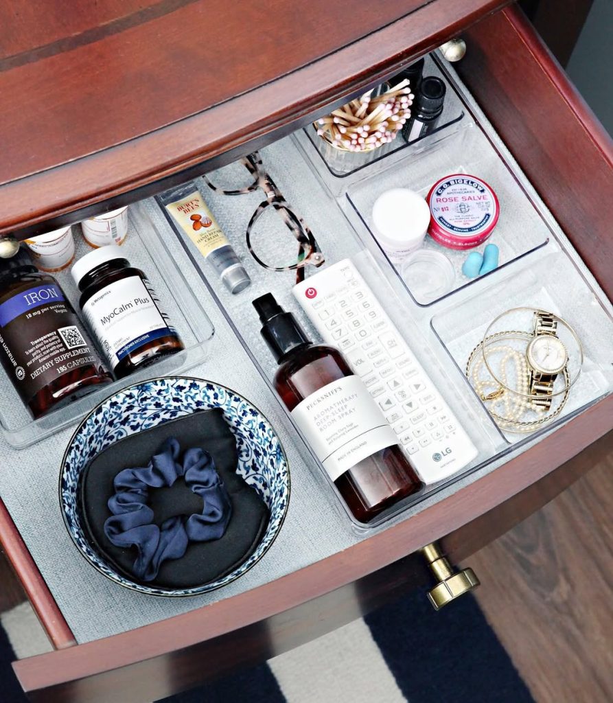 Line your drawer with a patterned contact paper or a piece of textured felt for a luxurious foundation. Then, use trays to organize vitamins, a soothing linen spray, and your favorite piece of jewelry.