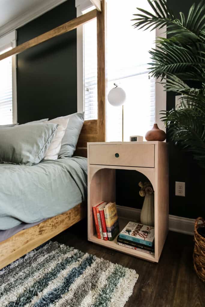 If your nightstand has an open shelf instead of drawers, embrace it as a design opportunity. Use the lower space for neatly stacked books, keeping your current reads accessible.