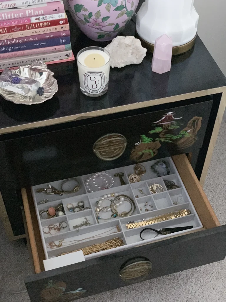 Turn a nightstand drawer into a sparkling sanctuary for your accessories. A plush, segmented jewelry tray keeps necklaces untangled and earrings paired.