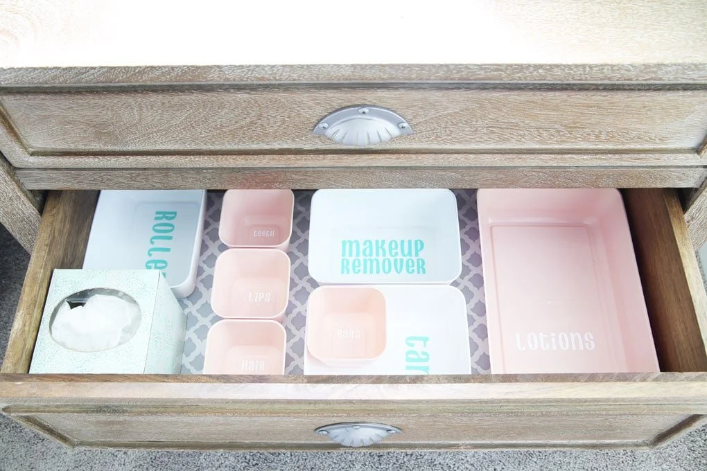 Bring a sense of calm order to your drawer with labeled bins. Use pastel-colored or white trays with stenciled labels for “Lotions,” “Makeup Remover,” or “Hair” accessories.