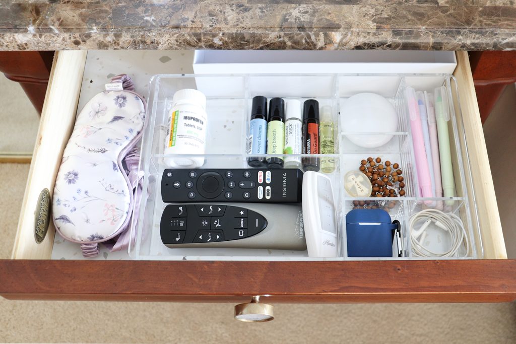 Achieve a calm, cohesive look inside your nightstand with a custom-fit drawer organizer.