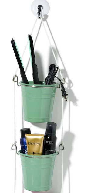 Two small metal pails become practical hair tool holders when you hang them from a suction cup hook.