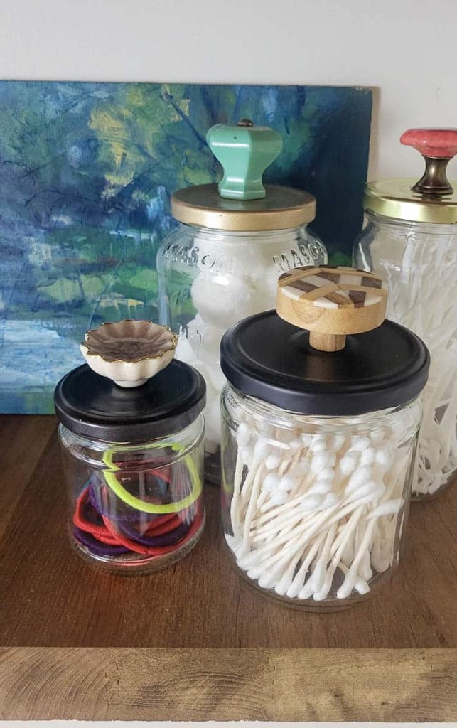 Simple glass jars can look elegant with a quick upgrade. Attach a decorative knob or a small ceramic dish to the lid, and you instantly create apothecary-style containers.