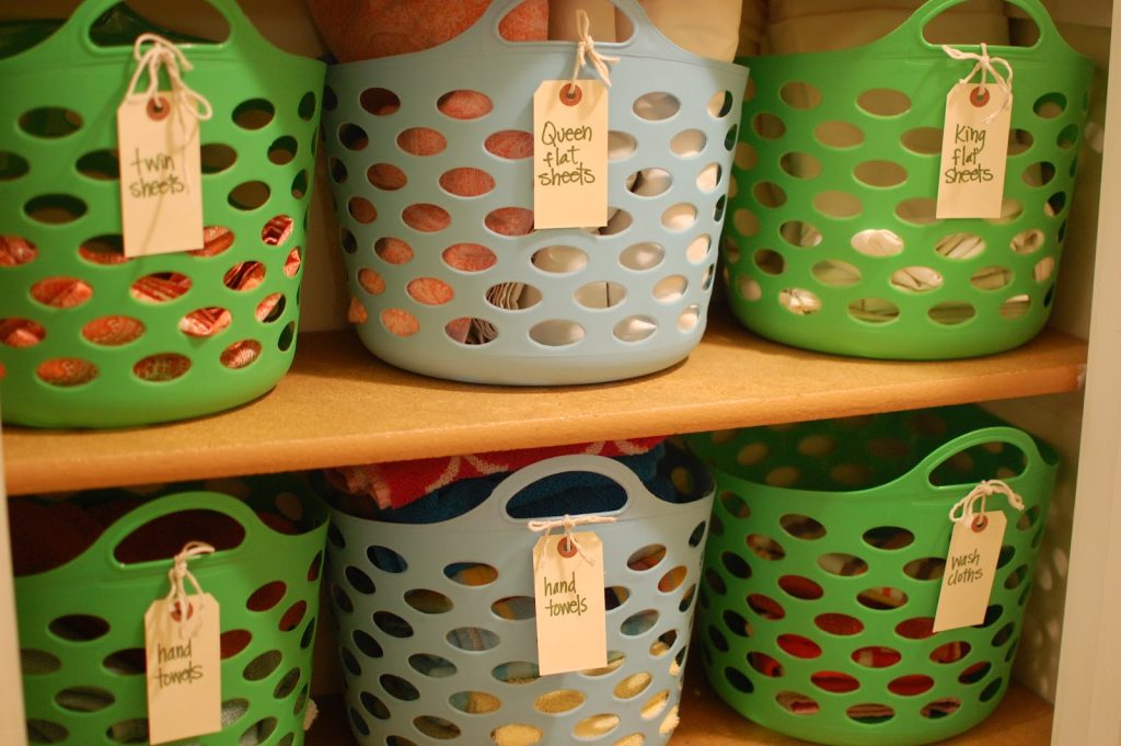Plastic laundry baskets offer a bright, helpful way to store bulky linens. You can group towels by purpose and assign each basket a color so they’re easy to spot.
