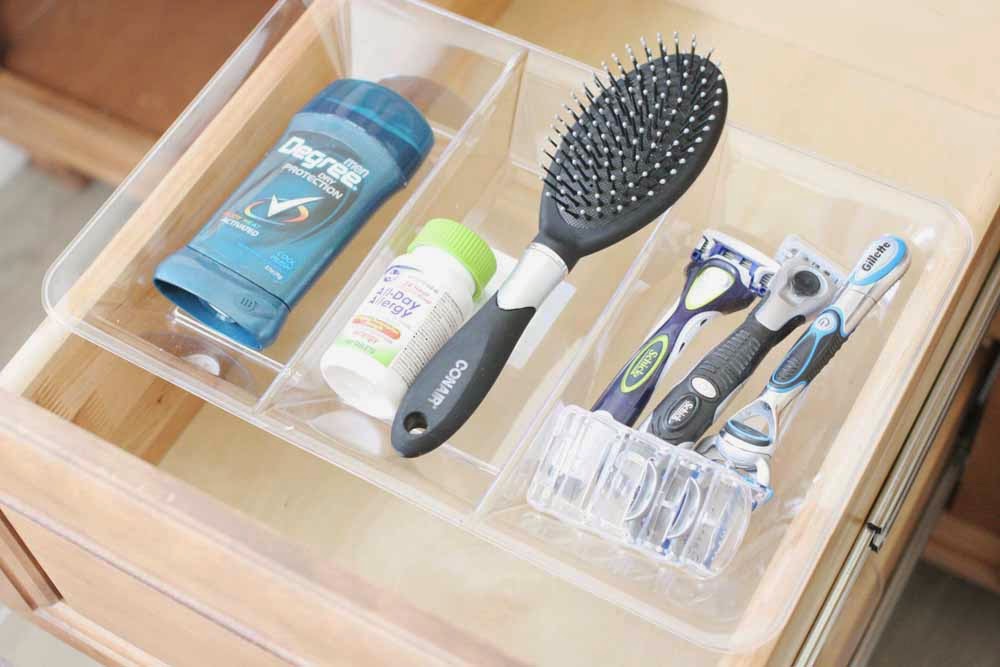 A clear plastic tray brings structure to a drawer that collects grooming essentials. You place deodorant, razors, and a brush into the separate sections, and the transparency makes everything visible in one glance.