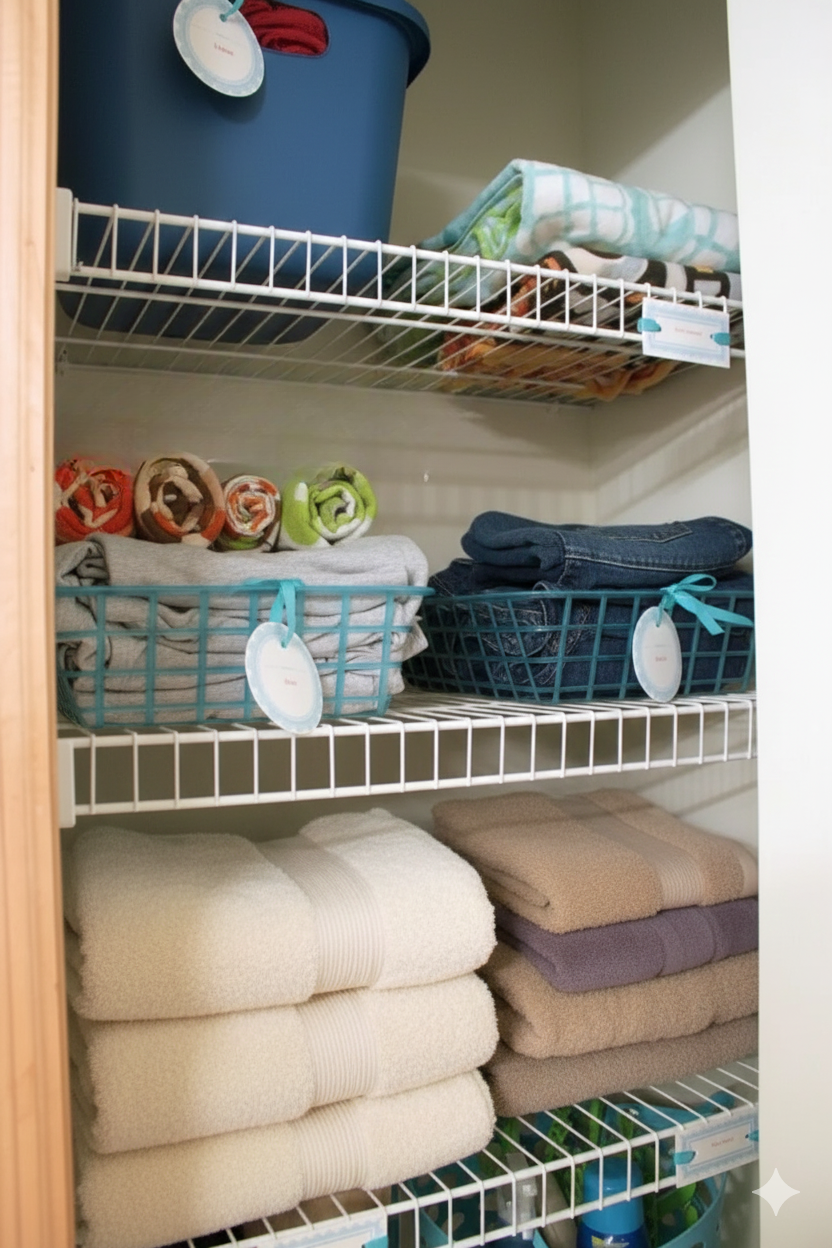 You sort towels by use, place them in breathable baskets, and slide them onto the shelves.