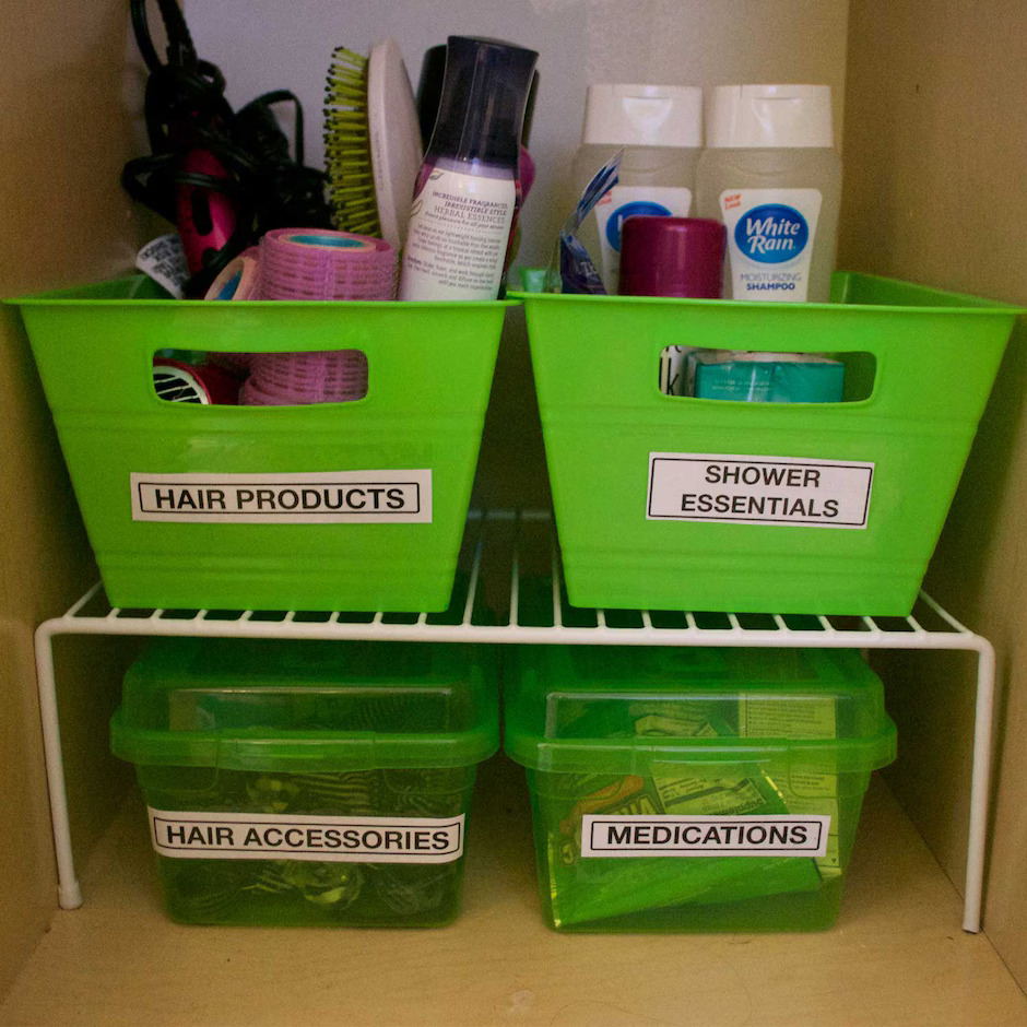 Bright green plastic bins bring life and structure to a dark under-sink cabinet. You group similar items together, label each bin, and slide them into place.