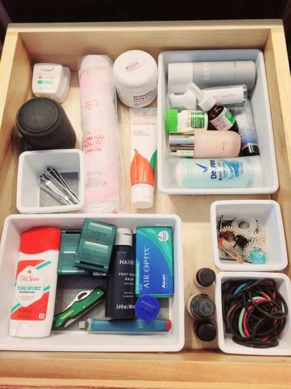 When you line a drawer with snug white bins, small items stop drifting into one big mess. You can assign a section to dental care, another to lotions, and one more to daily-use accessories.