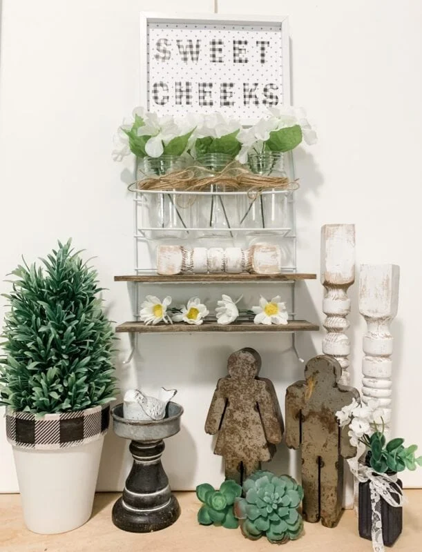 Place wire shelves for height, tuck mason jars with artificial blooms beside them, and add wooden candle holders for texture. A tiny sign or succulent brings softness and personality.