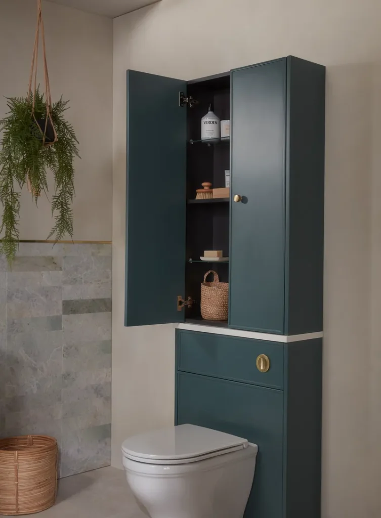 If you’re renovating, consider a built-in cabinet that wraps around the toilet. Paint it a rich shade like forest green or navy, then add brass handles for polish.