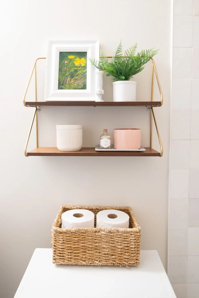 Floating wood shelves bring balance to small spaces. A pair of oak or walnut planks above your toilet can hold rolled towels, glass jars, or greenery.