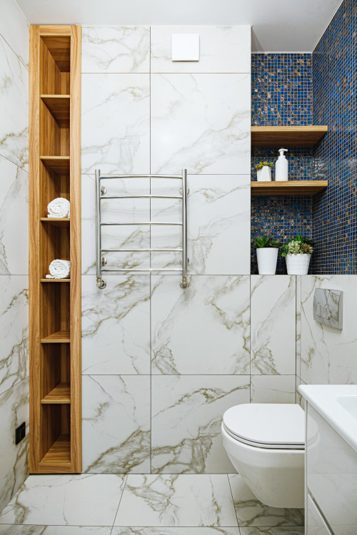 If you’re planning a remodel, think beyond shelves. A recessed niche beside or above the toilet adds sleek, built-in storage without crowding the room. Line it with warm wood or contrasting tiles for texture. The multiple cubbies keep things organized, and the custom look feels straight out of a design magazine.