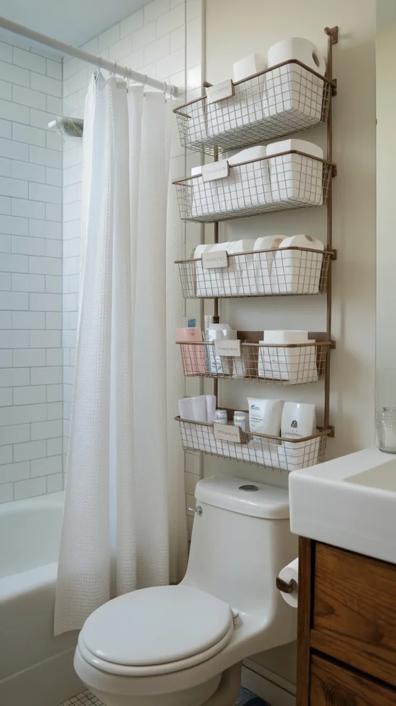 Need a renter-friendly idea? Use a tension-rod system that fits right over the toilet. Attach wire baskets in bronze or matte black for an industrial touch.