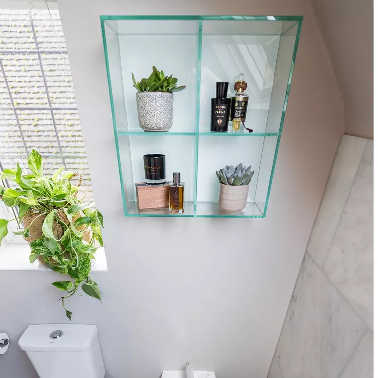 For a clean, modern look, use acrylic shelves. These transparent beauties almost disappear, making your bathroom look bigger and lighter.