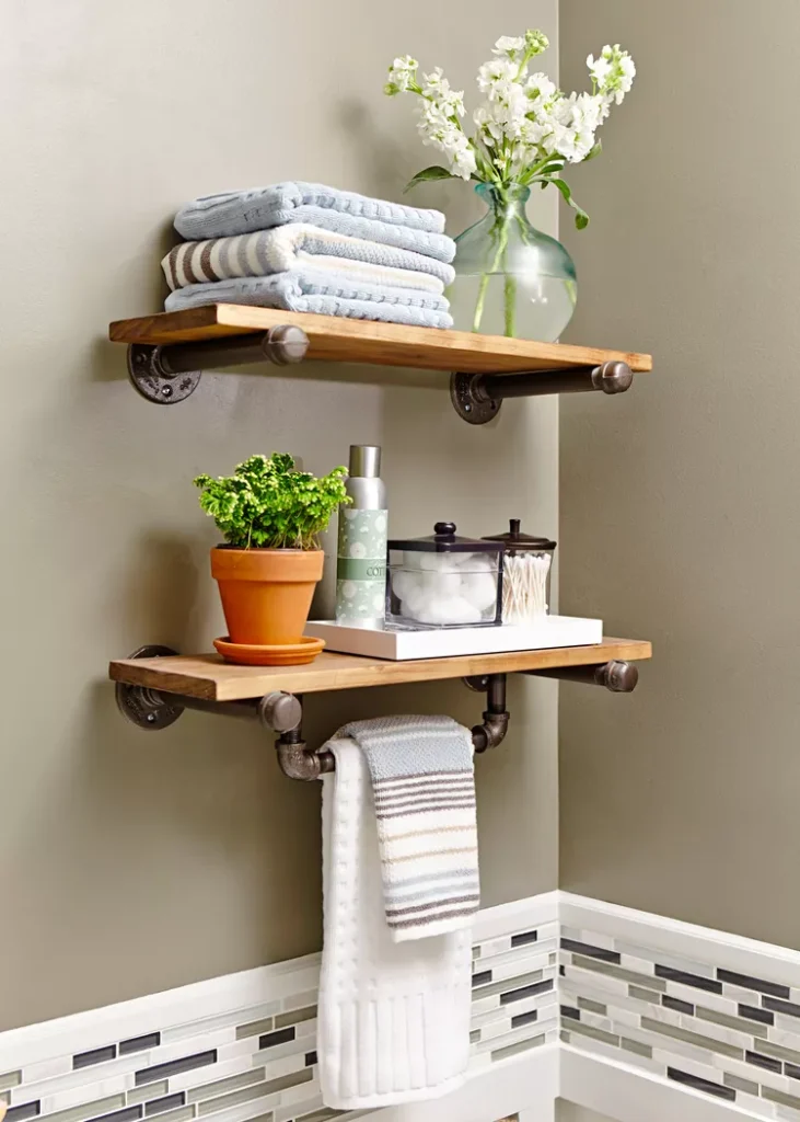 Add a rugged, industrial twist with pipe-supported wooden shelves.