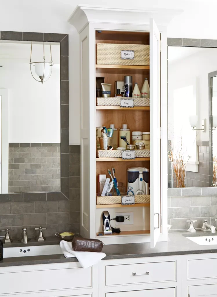 If you’re remodeling, carve out hidden cubbies in unused walls or between studs. They’re perfect for towels or small baskets and look more custom than surface shelving.