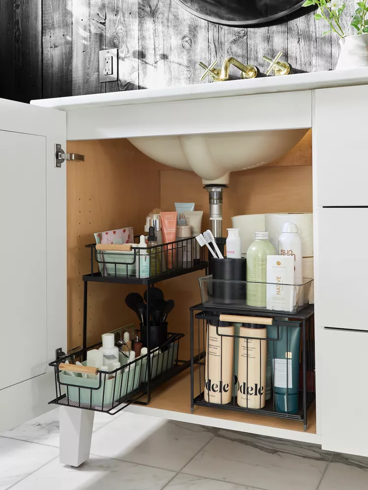 Under the sink, sliding wire baskets make everything easy to reach. No more digging to the back for your spare toothpaste!