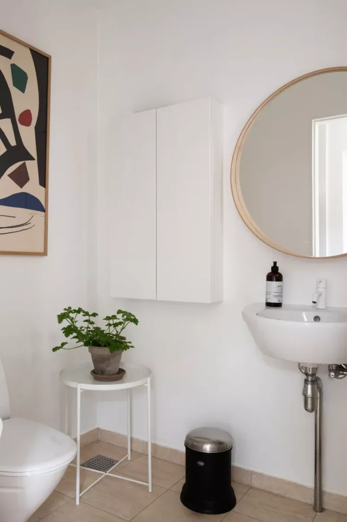 I like to mix practicality with decor — keep your everyday items like soaps and cotton jars on one shelf, and use another for candles or greenery.