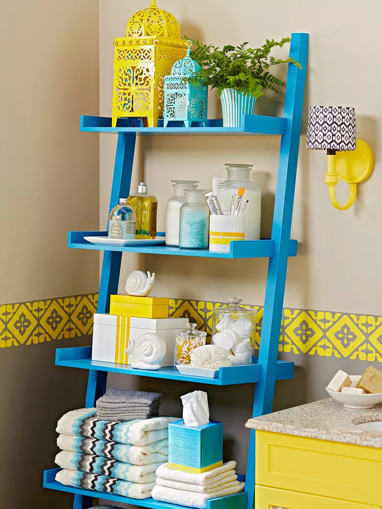 I like leaning one beside the shower — it looks chic and keeps everything within reach. Choose a bamboo or metal ladder depending on your bathroom’s vibe.