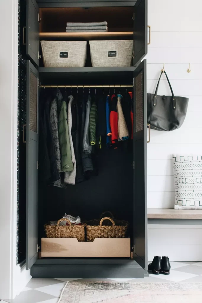Make your hall closet a design moment, not just a storage one. Hang coats on a central rod. Add woven baskets below for shoes or bags.