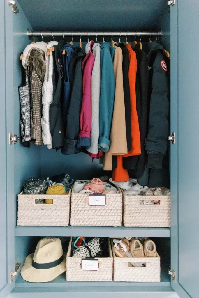Inside, hang clothes on a single rod. Below, line up matching woven baskets with labeled tags for shoes or accessories.