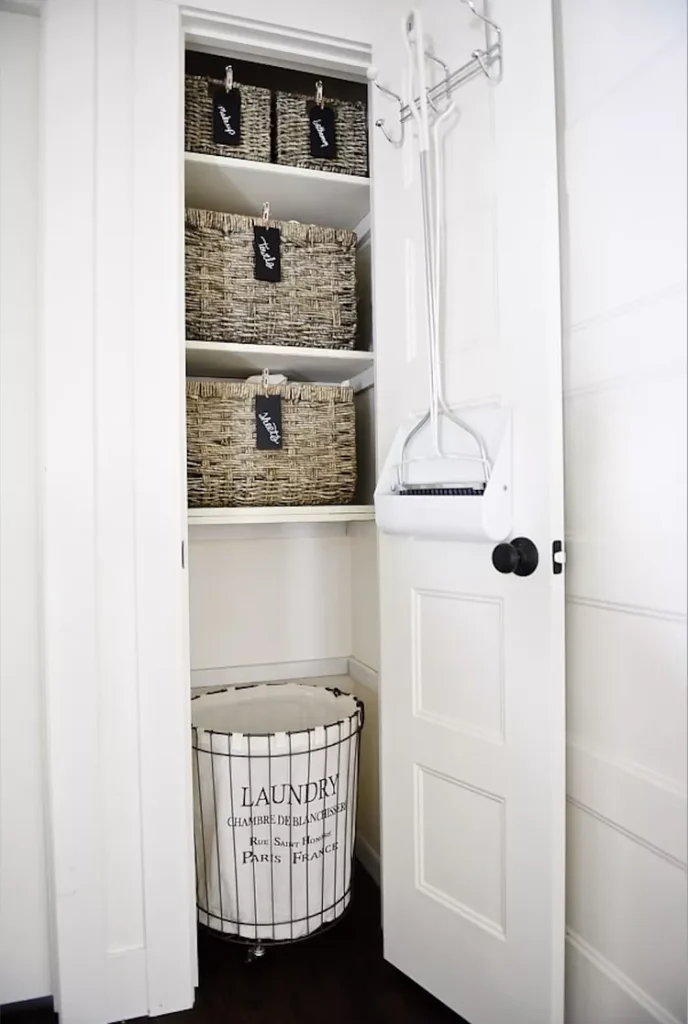 Use wicker baskets for rags, sprays, or cleaning tools. Add hooks or a slim over-the-door system for brooms and dustpans.