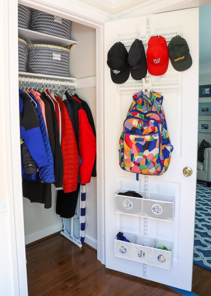 This idea turns your closet into the family’s out-the-door hub. A strong hanging rod handles coats and jackets. On the door, add adjustable racks or hooks for hats, scarves, and bags.