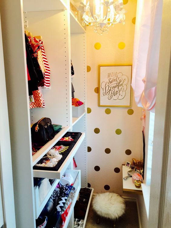 Even the smallest walk-in can exude glamor. This design proves it with a sparkling chandelier and whimsical gold polka dots on the wall.