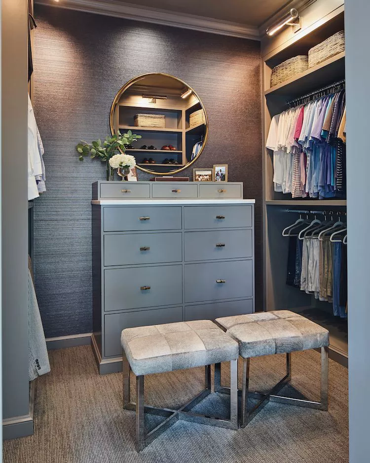 Notice the sleek drawer pulls and the textured carpet underfoot. Adding small, upholstered benches provides a comfortable spot and reinforces the feeling of a well-appointed dressing area.