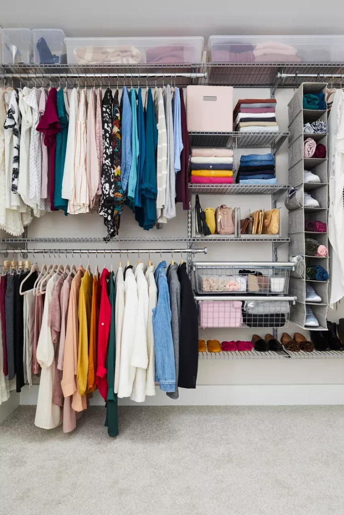 This system keeps clothes neatly organized by color and type, making outfits easy to assemble.